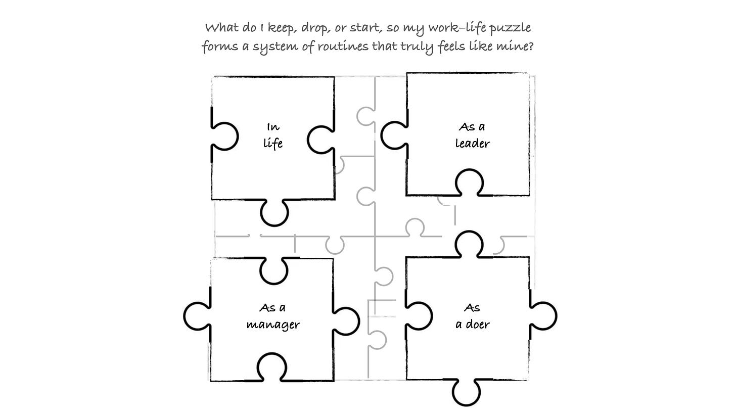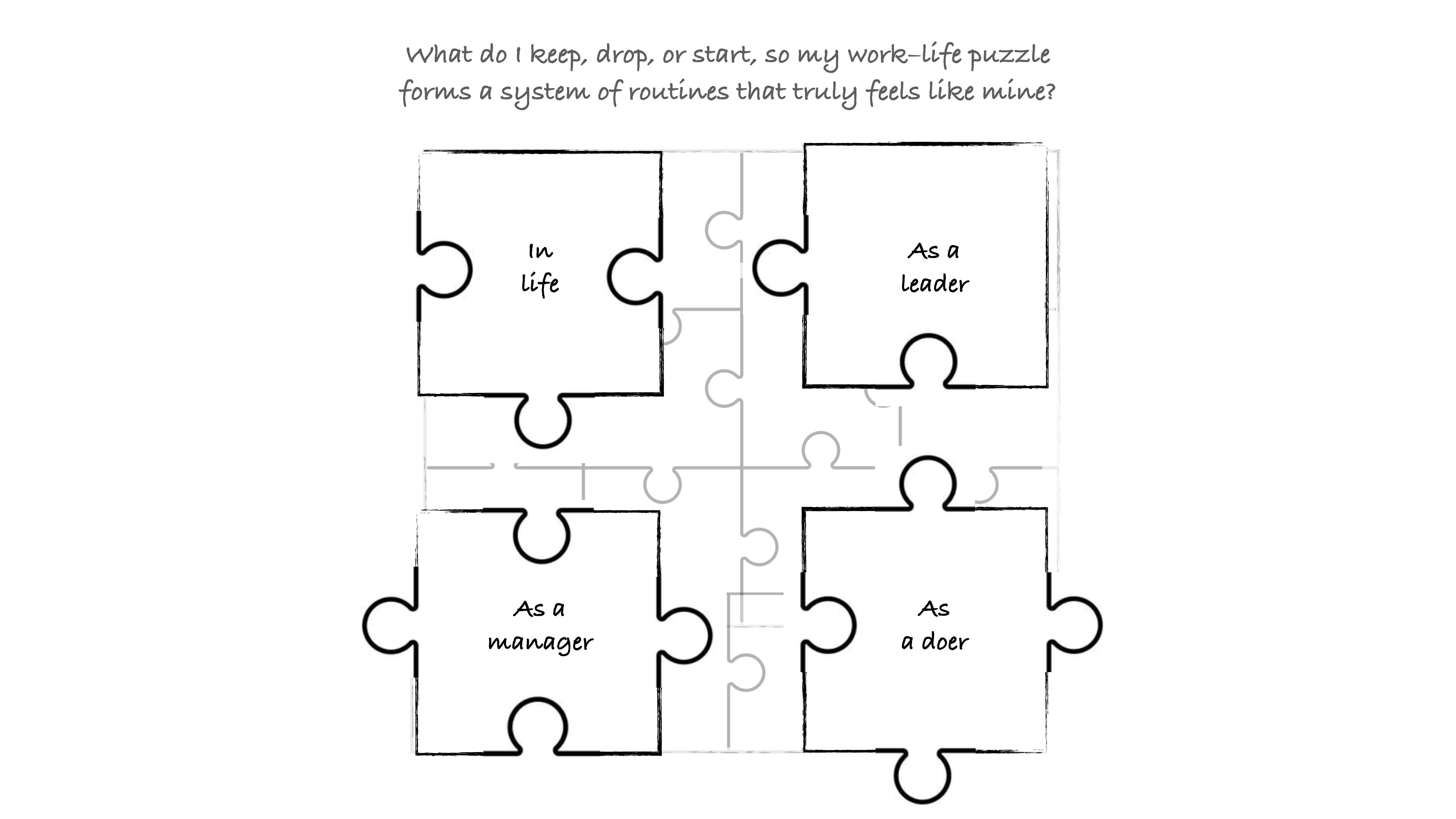 The key, as often, is balance. Finding the right blend of routines that define you: connected to your personal life (yes, that matters), your leadership stance, your role as a manager, and your work as a doer. Each of these dimensions deserves its own focus, and its own routine.
